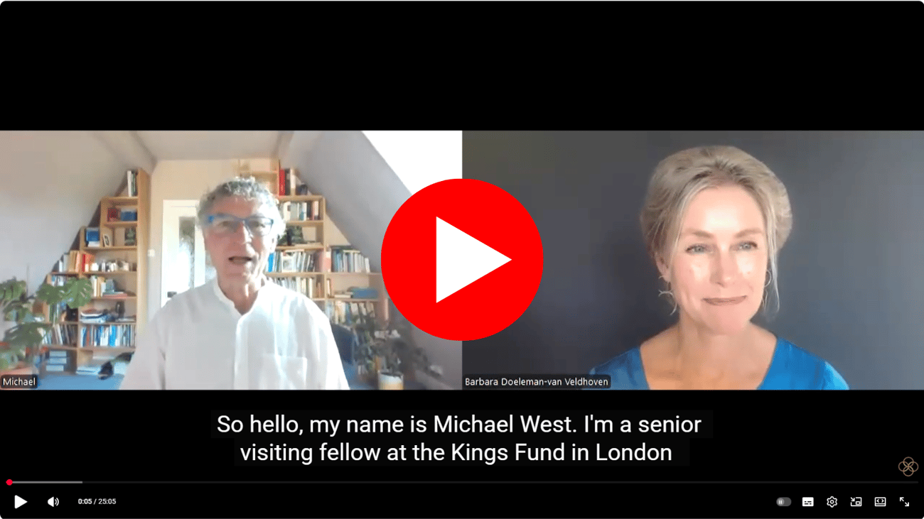 Tien jaar geleden ontstond in Nederland een beweging om compassievol leiderschap centraal te stellen in de gezondheidszorg, mede geïnitieerd door Barbara Doeleman-van Veldhoven. In dit Engelstalige interview gaat zij in gesprek met professor Michael West, die wereldwijd bekendstaat als inspirator en wetenschapper op het gebied van compassievol leiderschap in de zorg. Ze spreken over successen, uitdagingen en de hoopvolle toekomst van zorg waarin compassie de blauwdruk vormt. |